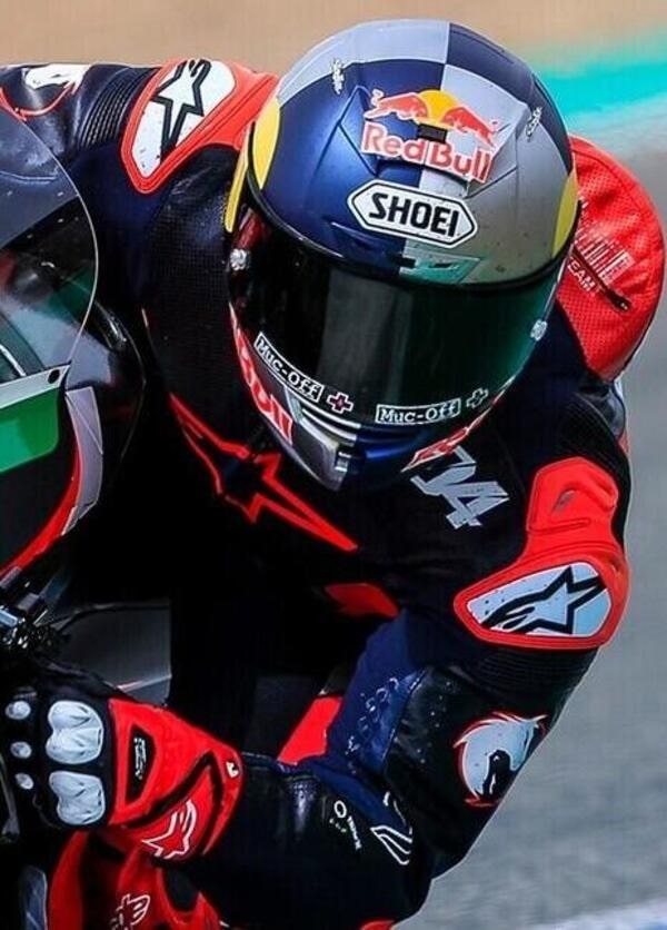 Scaduto il contratto con la Suomy, e quindi finiti i soldi, ha continuato ad indossare il suo Shoei, mostrandone finalmente il marchio. Un po’ come uno che rompe con la moglie e quindi è finalmente libero di uscire allo scoperto con l’amante.