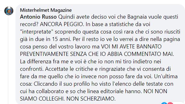 Faccio presente che io non ho mai scritto niente sui canali di TUTTOMOTORIWEB che il sig Antonio Russo dirige perché sono bannato preventivamente. Sono stato bannato ancora prima di andarci a scrivere per il solo fatto di menzionare la sua testata nei miei. A me non importa. Ma al sig. Antonio Russo, direttore di Tuttomotoriweb, evidentemente non basta ed è venuto a protestare nella mia pagina.