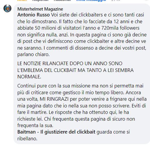 Per me non ci sono problemi. Se il sig Antonio Russo vuole gestire un sito acchiappaclick, affari suoi. Però io ho il diritto di rilevarlo tutte le volte che lo riscontro. SI CHIAMA DIRITTO DI CRONACA. E ho anche diritto ai analizzare la veridicità dei contenuti, la presenza o meno degli stessi, la discordanza col titolo, e la corrispondenza delle date a cui si riferiscono i fatti rispetto alla pubblicazione e la modalità in cui questi contenuti vengono proposti. E di fare tutte le altre valutazioni che ritengo opportune. Si chiama giornalismo questo. Anche se non piace al sig Antonio Russo direttore di Tuttomotoriweb con 50 miliohi di utenti annui e 750mila utenti social, perché non genera abbastanza soldi.
