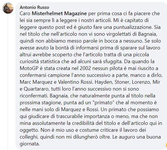 Il signor Antonio Russo, direttore del sito TUTTOMOTORIWEB, i cui post spesso evidenzio, è venuto a protestare piccato per avere io criticato il suo sito. Nello specifico questo post su Bagnaia che secondo Tuttomotoriweb, VUOLE un record la cui esistenza hanno però scoperto a tuttomotoriweb, ovvero quello di essere il terzo pilota a bissare il titolo per due anni consecutivi. Come fa Bagnaia a volere un record di cui non sa l’esistenza fra l’altro eguagliandolo e non battendolo? E come fa a entrare nella storia ancora prima che inizi il campionato? Mistero.