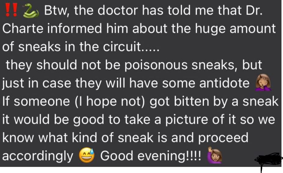 Per quanto riguarda il primo problema, Dorna avrebbe comunicato che la maggior parte non sarebbero velenosi e, in caso di morso, la cosa migliore da fare sarebbe una foto, tanto per capire, se serve un antidoto (sono QUASI tutti disponibili), oppure no.