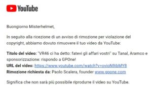 Dopo qualche giorno ho ricevuto una notifica da youtube che mi informava di aver cancellato il video per violazione di Copyright, richiesta effettuata dallo stesso Paolo Scalera. Eccola qui.