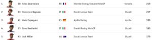 Tornando alla gara, è nera per Quartararo (non va nemmeno alle interviste post gara), difficile per le Aprilia, che comunque salvano la faccia, e fortunata per le Honda, che col bagnato vanno un po’ meglio, ma non c’è molto altro da segnalare, se non il fatto che sono solo due le cadute (pochissime per una gara bagnata). Vanno out Gardner e Marini, nel suo primo zero della stagione.